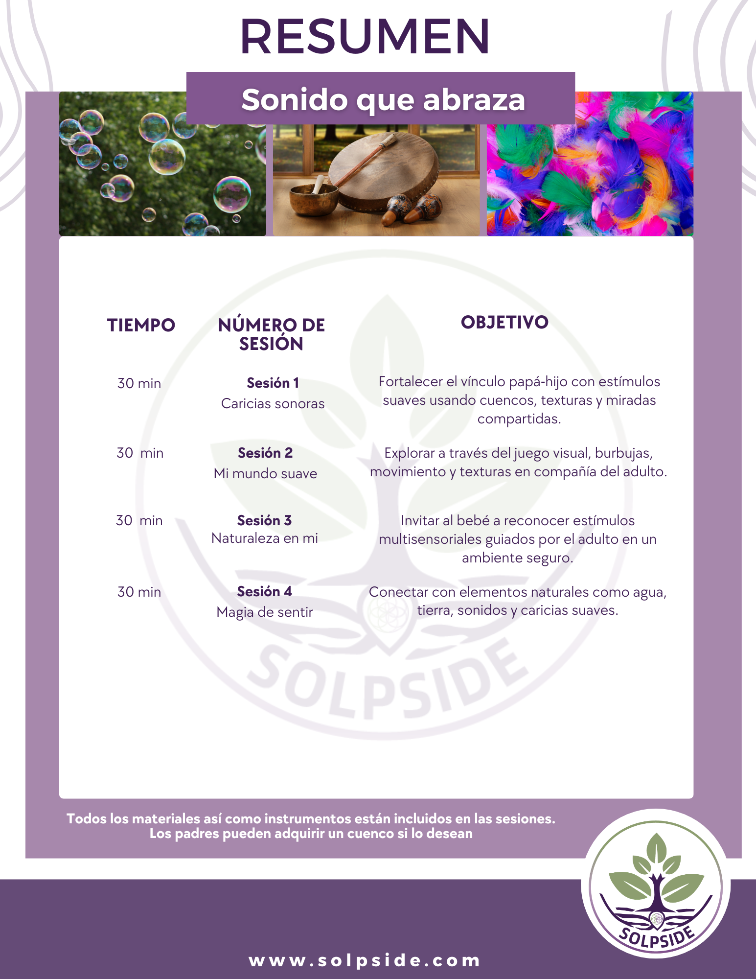 Este taller acompaña a bebés (11 a 2 años) y papás en una experiencia sensorial y amorosa, con elementos suaves, sonidos, sabores y texturas. Está diseñado para fortalecer el vínculo desde el contacto físico, el movimiento compartido y la vibración sonora como elemento central.